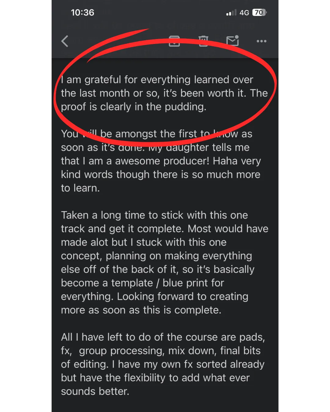 While YouTube offers valuable resources, it lacks the structured, comprehensive approach that this course provides. On YouTube, you might find individual tutorials that focus on specific techniques or skills, but there’s no clear pathway or system to take you from feeling “stuck” to consistently finishing tracks, and you don't have the ability to join a private group coaching sessions or have access to a supportive community of likeminded music producers.