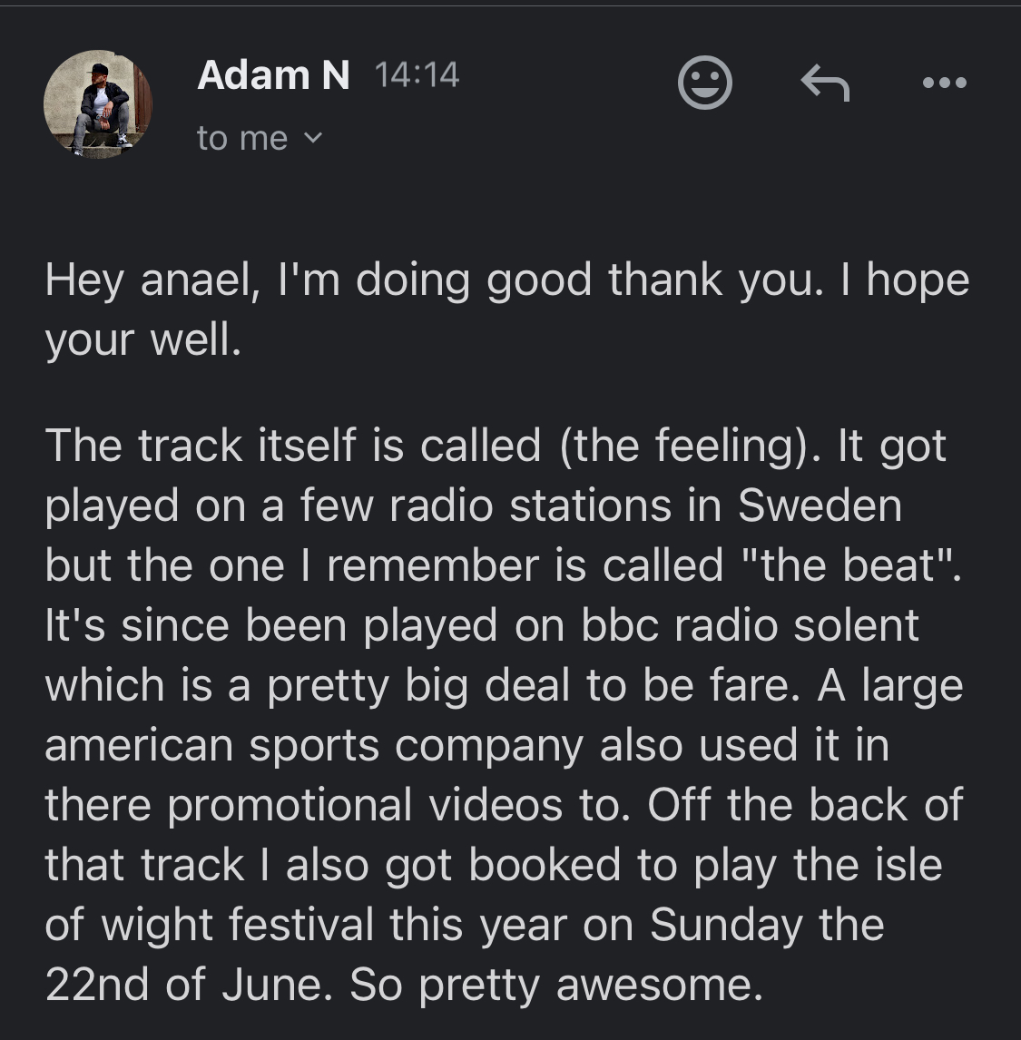 "My song 'The Beat' is playing on BBC Radio Solent, an American sports company used that song in a commercial!"